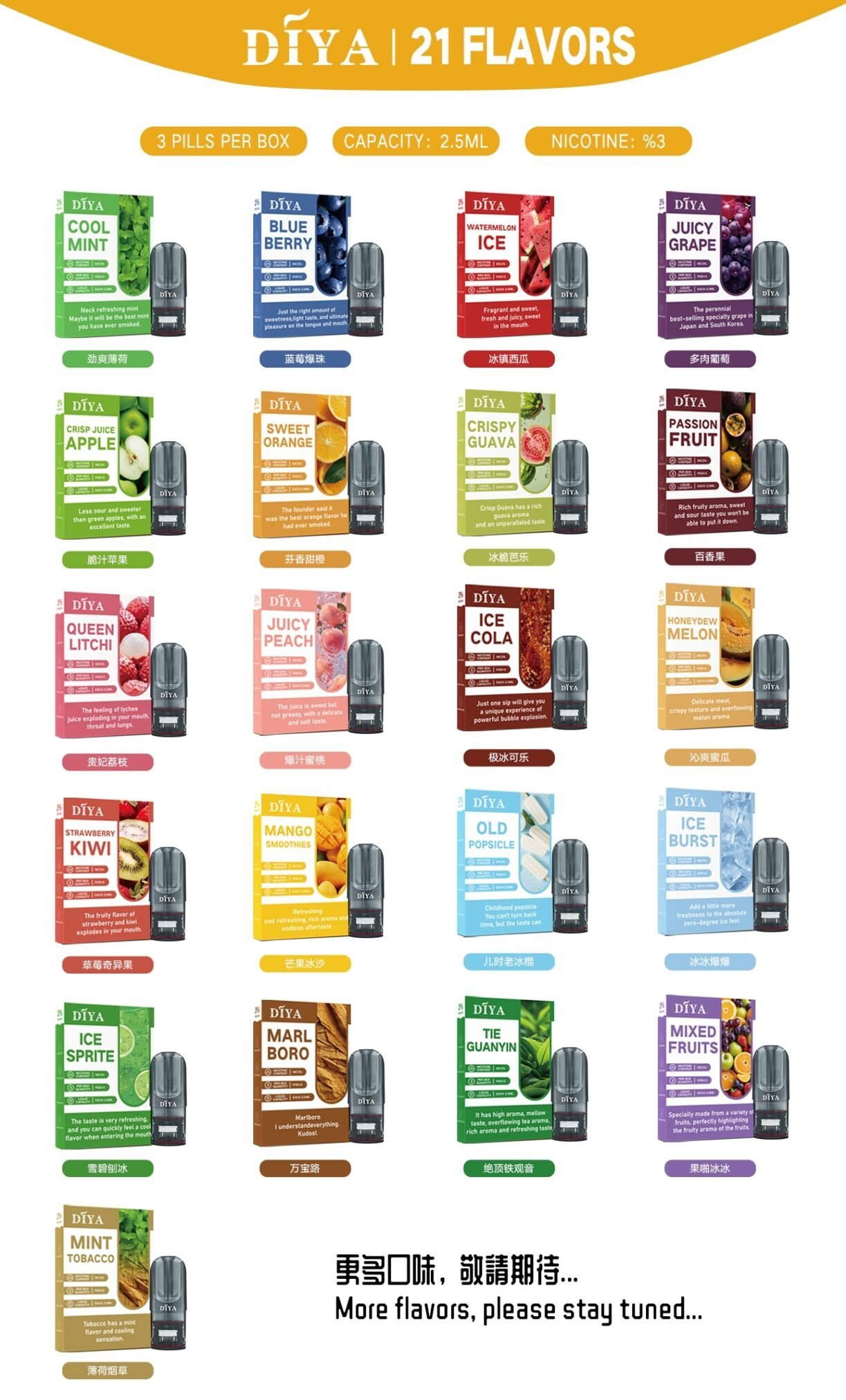 DIYA叮啞煙彈以其豐富多樣的口味選擇和先進的霧化技術,成為電子煙用戶的理想選擇。每盒3顆裝,每顆2.5mL大容量,持久耐用,滿足日常需求。